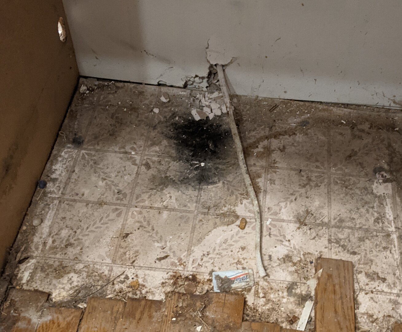 Pulling the dishwasher away from the wall, one of the power wires ripped out of its wire nut and shorted to the case ground. The installers hadn’t used a strain relief and had just punched a hole in the drywall for the cable, so pulling it out we found damaged drywall and some gross mold on top of the original linoleum. I replaced a large patch of drywall behind the dishwasher and installed an electrical outlet in the upper-right corner. Then I installed a new power cable for the machine with a strain relief.
