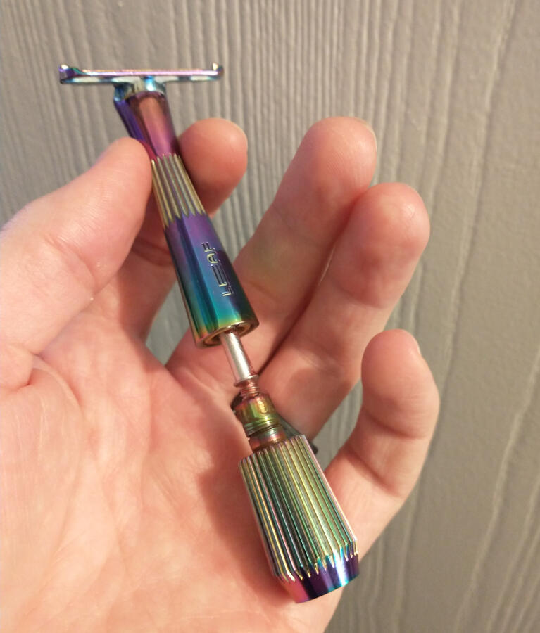 About two years ago my wife was target-advertised Leaf razors, right around when I was about to replace my normal plastic disposable razor. The quantity of plastic wrapped around the metal was really irritating to me, so I decided to buy a Leaf razor. I bought their 3-blade Leaf razor, and I really liked it. I STILL really like the 3-blade razor, and I use it for shaving in the shower and would definitely recommend it: it’s got a huge plate on the end that keeps all the blades in line and a spring that feels like it applies just the right amount of pressure. I have never cut myself with it, and it gets rid of armpit hair great.