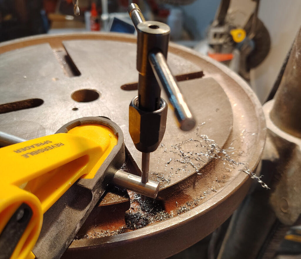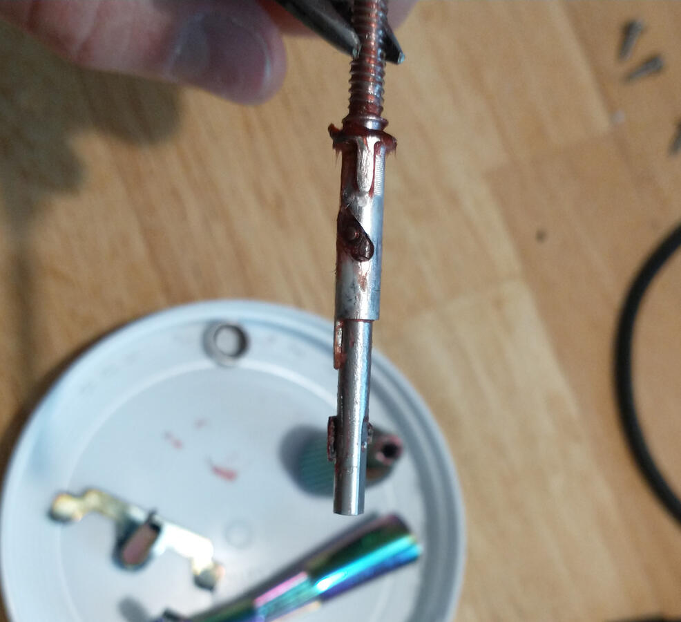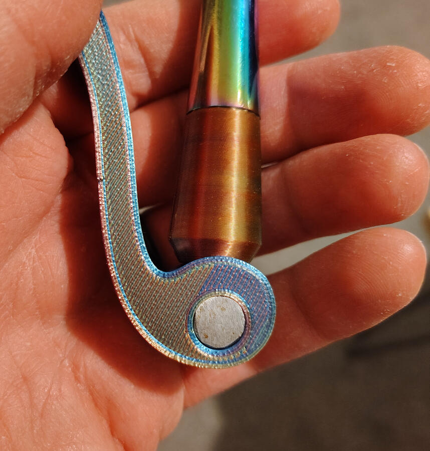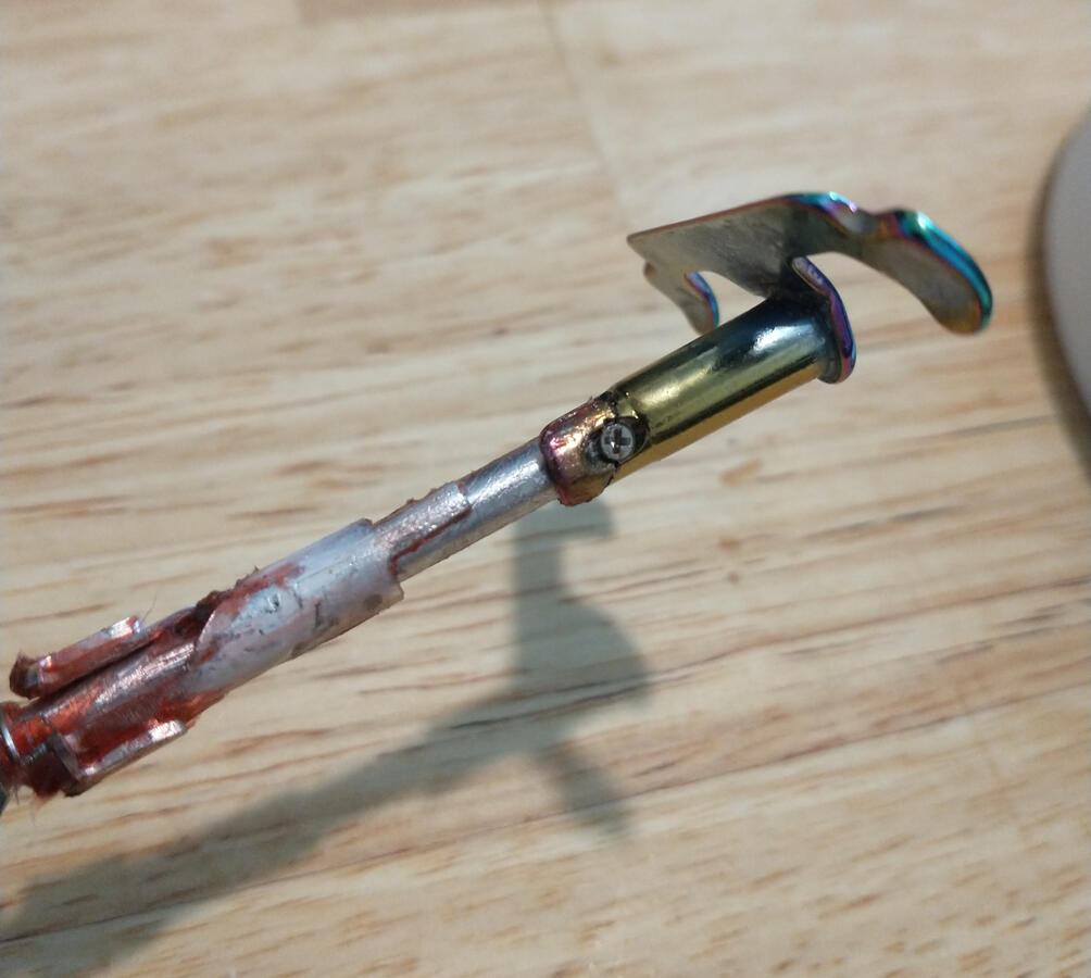 That means that the only bit of metal that is actually connecting the lid to the thing that pulls down on it is the little bit of metal on either side of the screw on this one side of the tube. That’s like 2 or 3mm^2 cross-sectional area, which you would think could be sufficient, but that screw hole also creates some problematic stress concentrations. If the hole just went all the way through the shaft so the screw went all the way through and supported the tube on both sides, that would effectively double the strength of the device, although I think there are other better options.