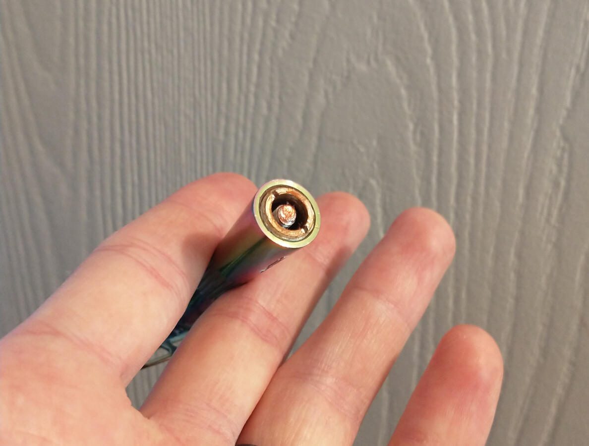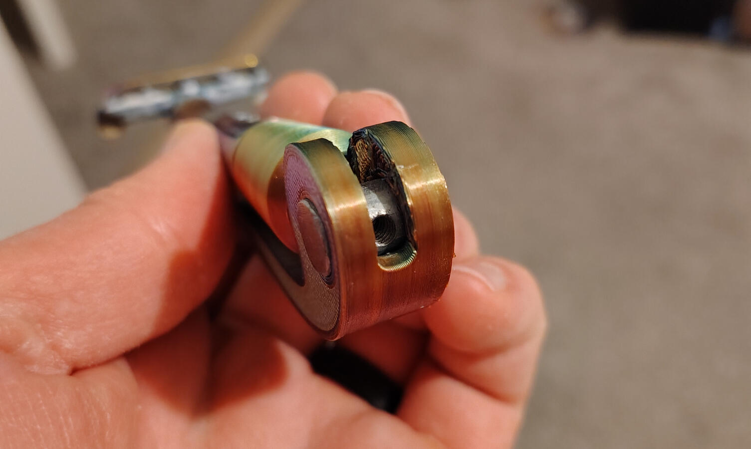 That means that the only bit of metal that is actually connecting the lid to the thing that pulls down on it is the little bit of metal on either side of the screw on this one side of the tube. That’s like 2 or 3mm^2 cross-sectional area, which you would think could be sufficient, but that screw hole also creates some problematic stress concentrations. If the hole just went all the way through the shaft so the screw went all the way through and supported the tube on both sides, that would effectively double the strength of the device, although I think there are other better options.