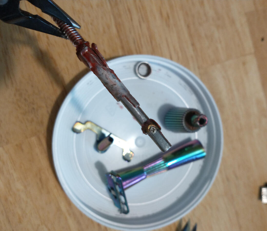 If you use one of these and the handle starts to turn with less resistance than you expect, DO NOT USE IT. I would bet dollars to donuts the lid tube has failed, and you’re about to cut your face with an unsecured razor blade like me.