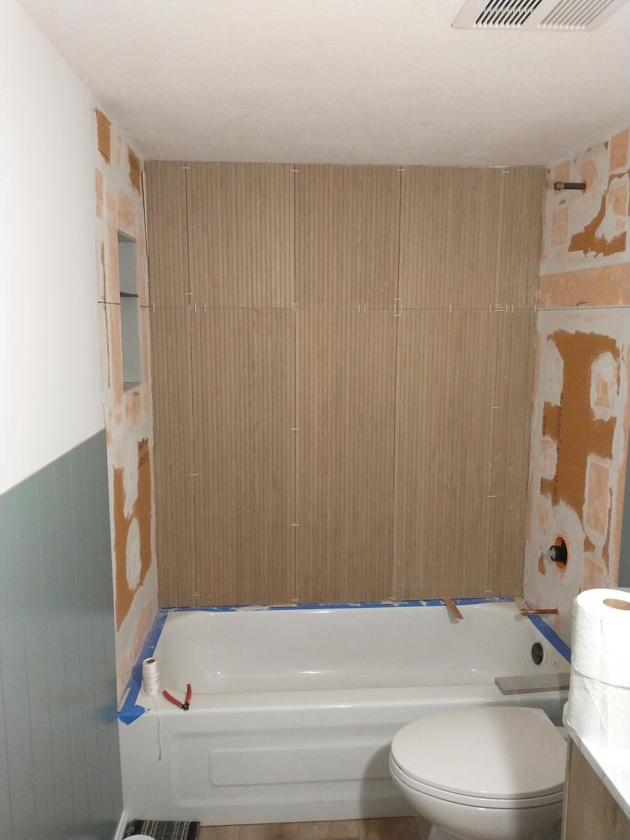 All that added at least 5 days to the project, while we waited for the tub finish to cure so the plumber wouldn’t scuff it with shoes or parts, while we waited for them to do the work, while I dried the wall out in the winter any time the outdoor temperature was over freezing, and while I replaced the drywall.