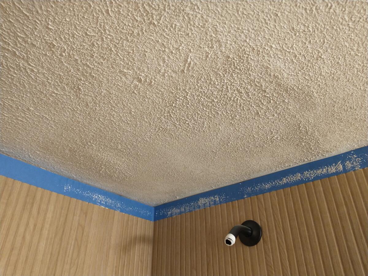 It took a while to figure out, but the ceiling was probably textured with one of those rollers that you use to apply deck stain. The ceiling texture is rough, pointy, and sharp. I was able to almost perfectly match it using a deck roller.