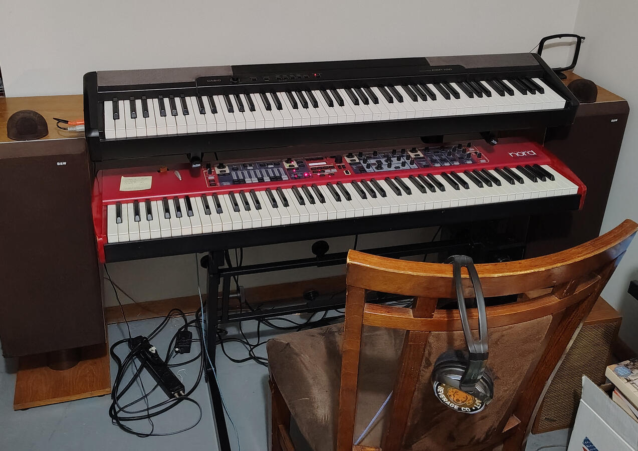 This On Stage double-decker Z-shaped piano stand is nice, but lacking in adjustments. Guitar Center sells them for about $150, and I got mine in open-box condition while there was a sale for a bit less. Especially for the price, it feels robust and just like a good all-around surface to put your keyboards on, but you can improve it immensely just by popping some more holes in it with a drill.